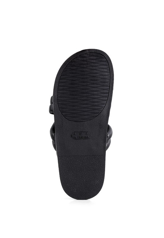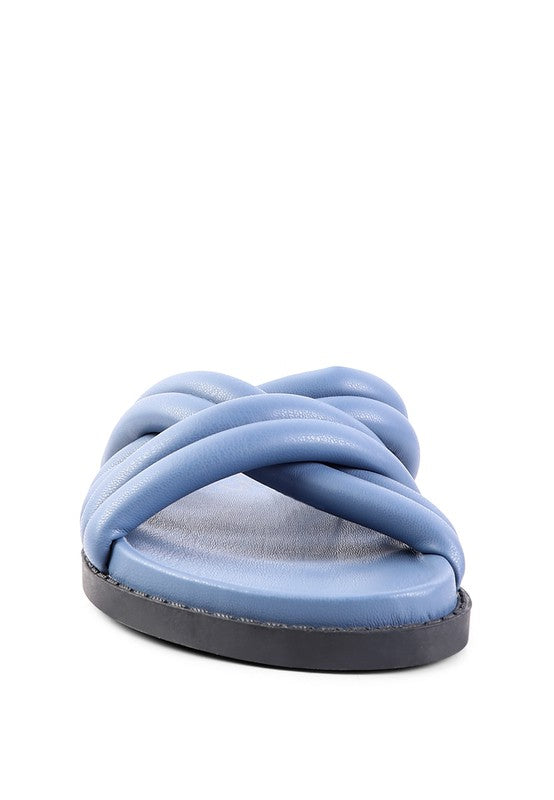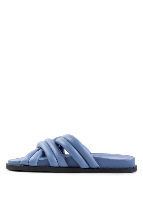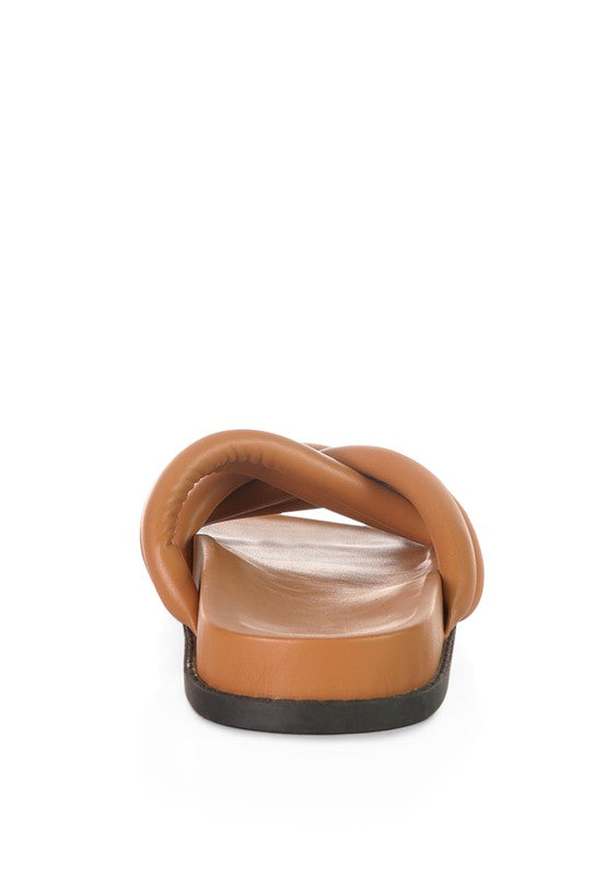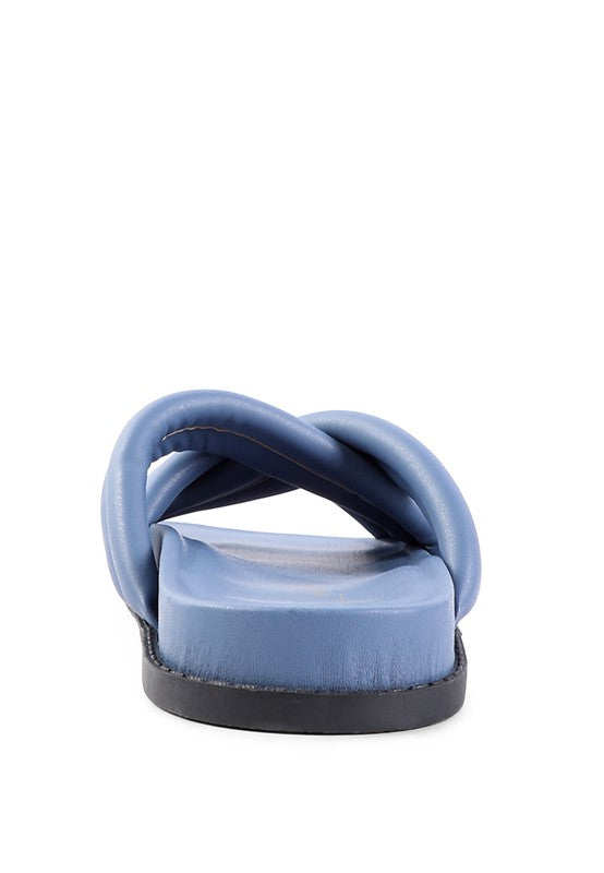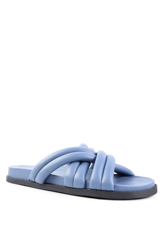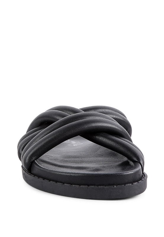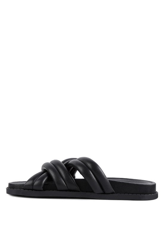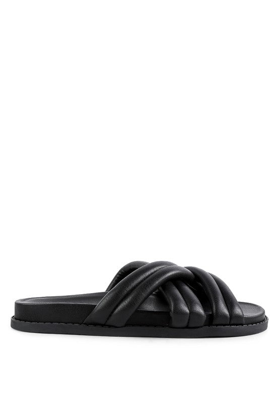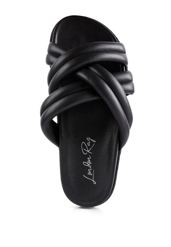 Cushioned crisscross straps slide featuring molded footbed. Perfect footwear for going from street to beach. Type: Slides Upper material: PU Lining Material: Polyurethane Outer sole: TPR Open Round Toe Slip-On Style Crisscross strap Moulded footbed SH2944