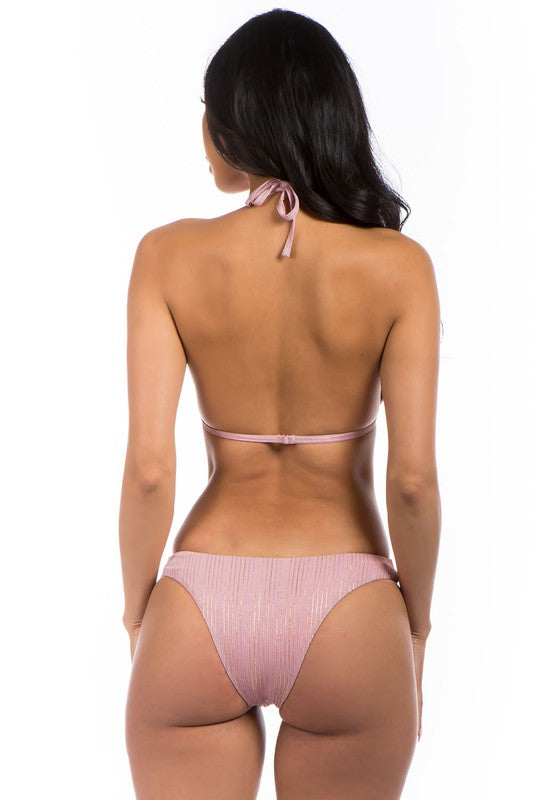 Two-piece bikini, adjustable halter top Beautiful vertical gold strips detail on bikini Available in blue, jungle, and rose.